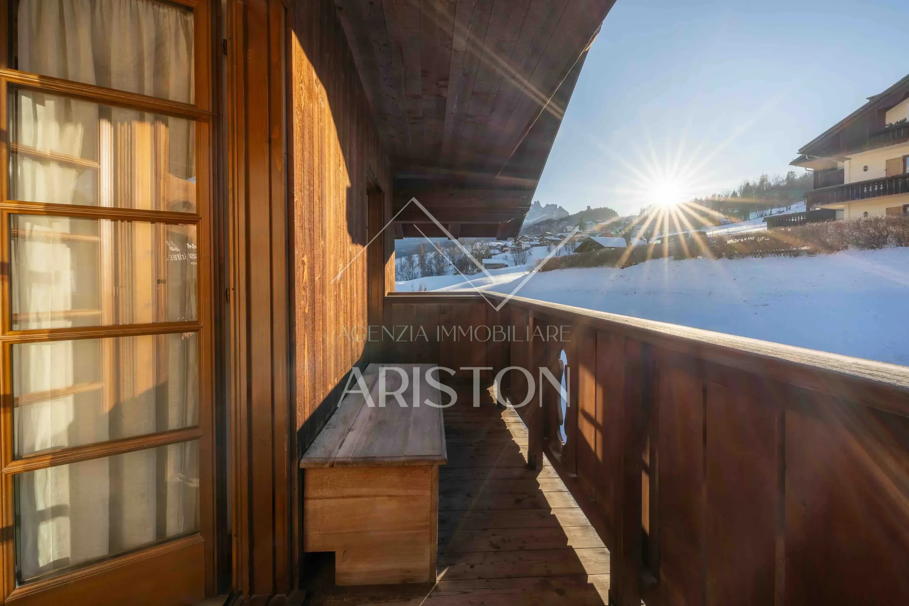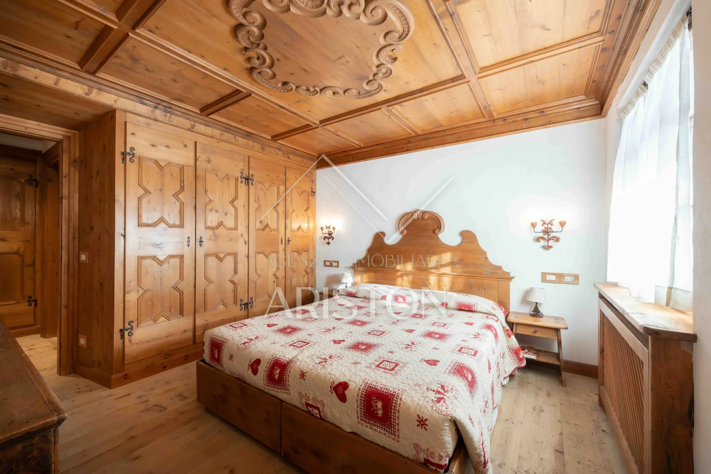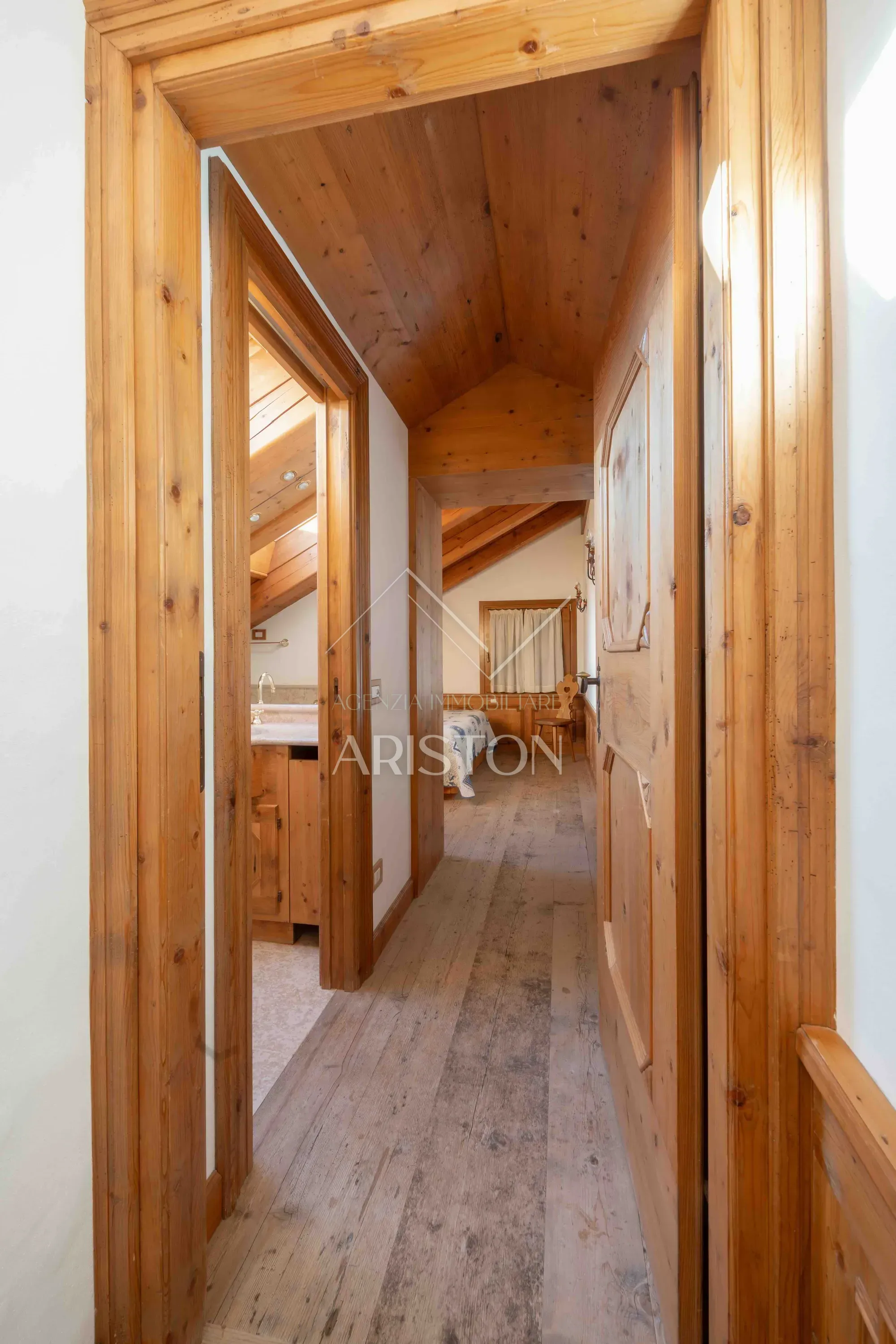 In una tipica casa ampezzana ristrutturata, l’appartamento si trova al primo piano ed è disposto su due livelli, combinando il fascino dell’architettura tradizionale con comfort moderni.